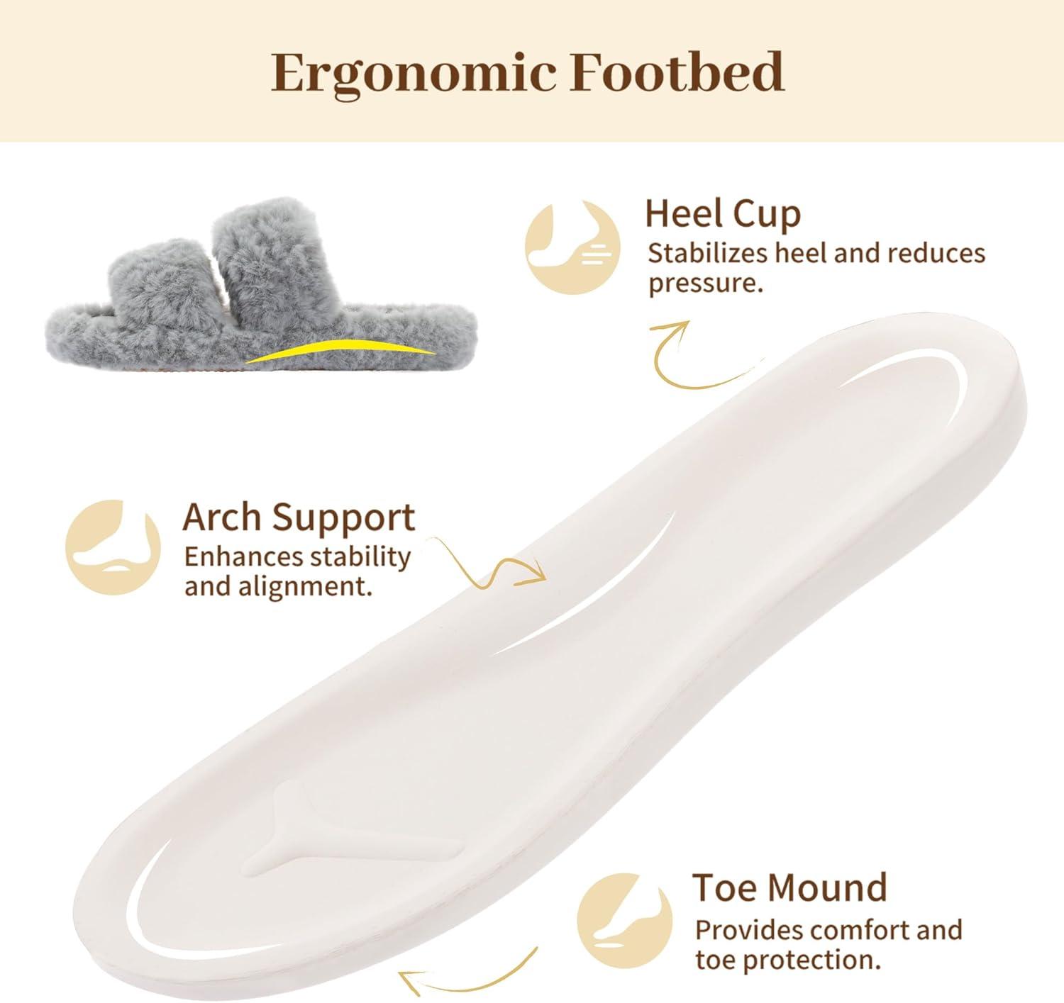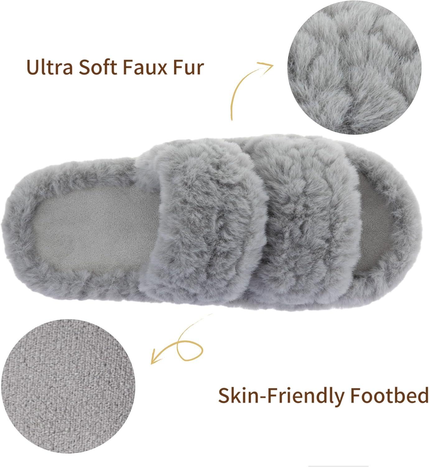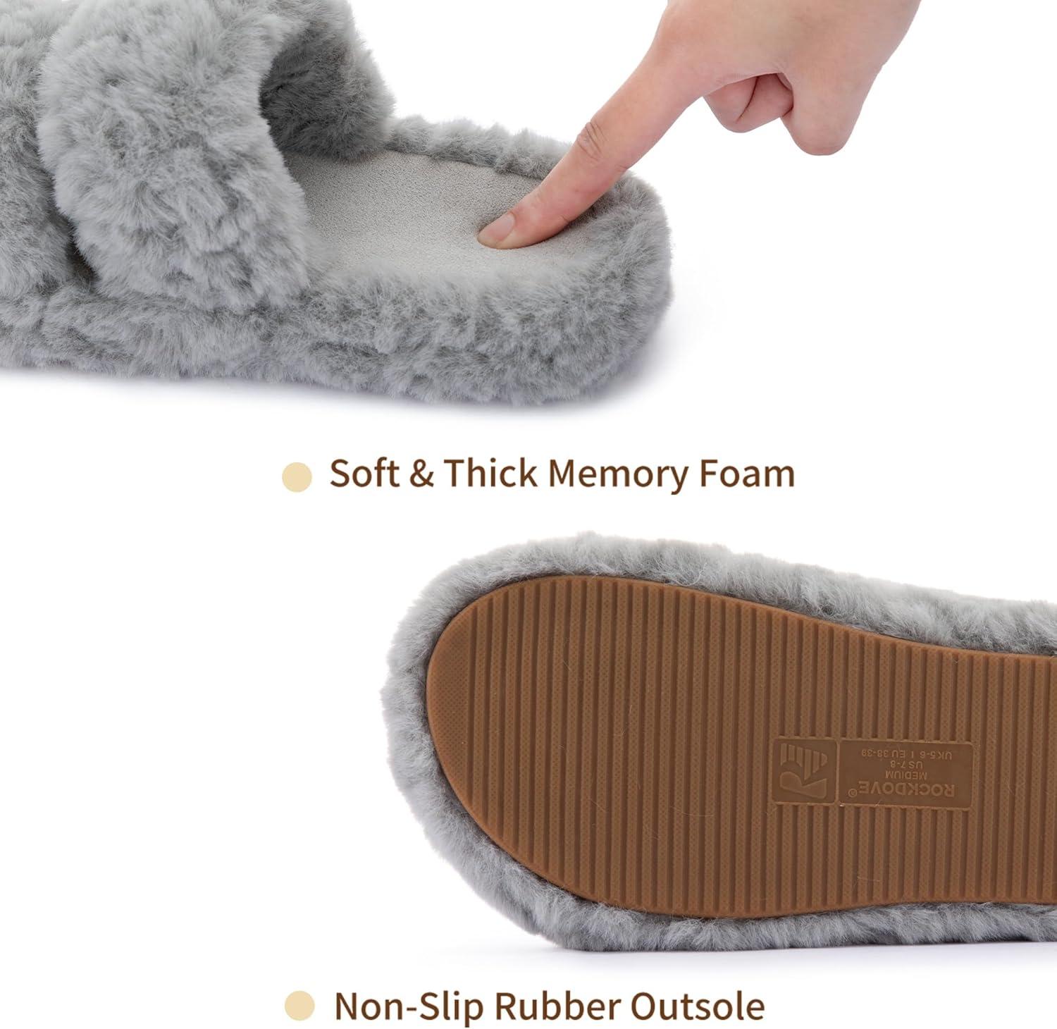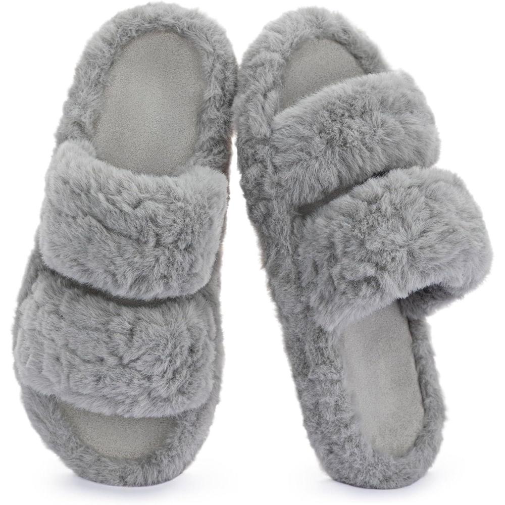 RockDove Women’s Pluffie Slippers with Arch Support & Memory Foam, Cozy Faux Fur Open Toe House Shoes, Gift-Ready Indoor Outdoor Comfort(Grey)